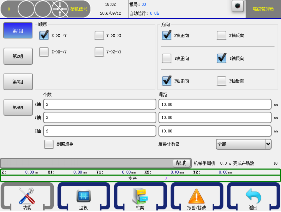 點擊將要使用的堆疊程序組(如第1組),在順序欄選擇產品要堆疊的順序, 設定好每個軸的堆疊產品個數和產品堆疊間距。