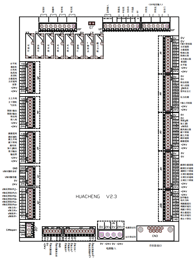 華成注塑機(jī)械手控制系統(tǒng),為標(biāo)準(zhǔn)系列產(chǎn)品,HC-S2。系統(tǒng)的主控制板接線方式如下: