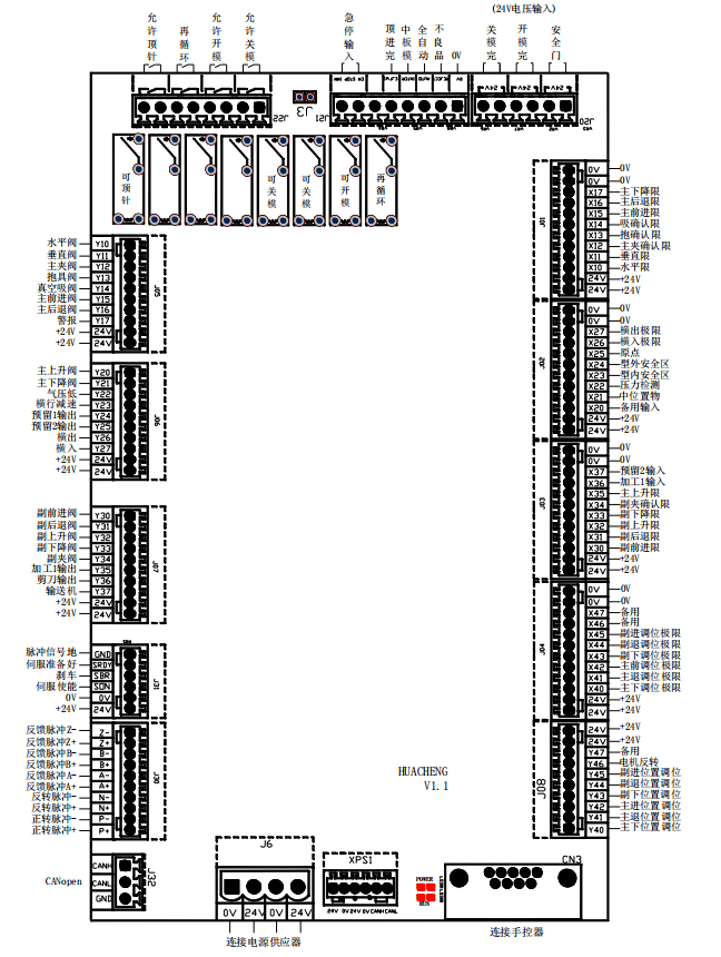 華成標準系列注塑機械手控制系統,HC-S1,單軸注塑機械手控制系統。主控制板接線圖如下: