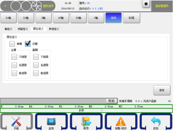 華成系列注塑總線機械手控制系統,RC-SX。系統的結構按鈕頁面分“軸定義”、“預留定義”、“限位定義”和“其他定義”。限位定義是如何理解呢?如下介紹: