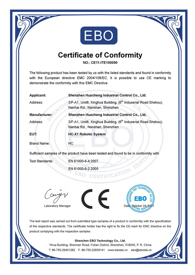 我公司于2011年10月24日HC-X1斜臂式機(jī)械手控制系統(tǒng)順利通過(guò)了CE-EMC測(cè)試,并領(lǐng)取了該產(chǎn)品認(rèn)證CE證書。