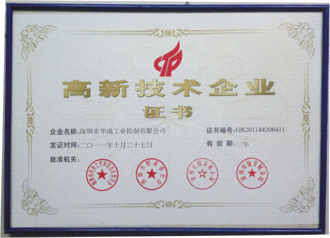 深圳市科技工貿(mào)和信息化委員會(huì)、深圳市財(cái)政委員會(huì)、深圳市國家稅務(wù)局、深圳市地方稅務(wù)局四家政府部門經(jīng)過聯(lián)合評(píng)審,于二0一一年十月二十七日,授予華成公司國家級(jí)“高新技術(shù)企業(yè)”證書,證書編號(hào)為GR201144200411。